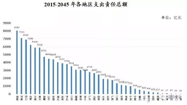 從地區(qū)分布看,中西部地區(qū)支出壓力較大。2015-2045年間,支出責任總額前五位的分別為湖南8047億元、河南7086億元、四川6906億元、內(nèi)蒙古6241億元和云南5896億元,年均支出分別為260億元、229億元、222億元、201億元和190億元,分別占2017年本省一般公共預算支出的3.8%、3.1%、2.6%、4.4%和3.3%。